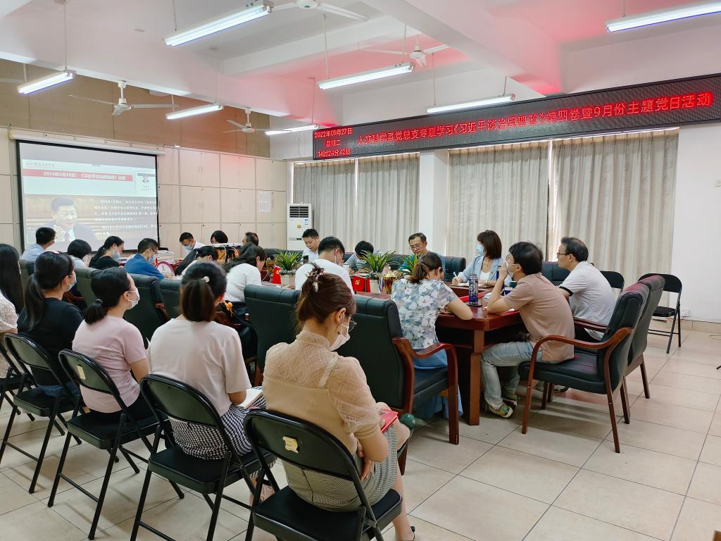 9月27日下午,人文科学系党总支开展专题学习《习近平谈治国理政》第四卷暨9月份主题党日活动。人文科学系全体教师党员以及学生党员通过线上线下相结合方式进行。会议由人文科学系党总支书记李国鹏主持。