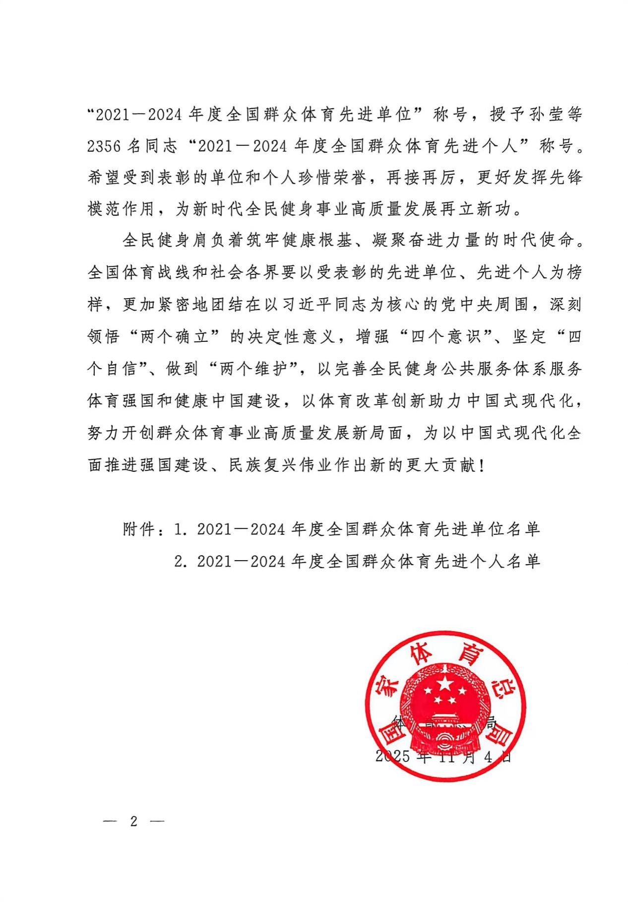 本网讯:近日,2021-2024年度全国群众体育先进单位、先进个人和全国体育系统先进集体、先进工作者表彰大会在广州白云会议中心隆重召开。Beat365官方网站荣获“全国群众体育先进单位”荣誉称号,以表彰学校在推动群众体育事业发展、构建全民健身公共服务体系中的突出贡献,是继2001-2004年度再次获此殊荣。