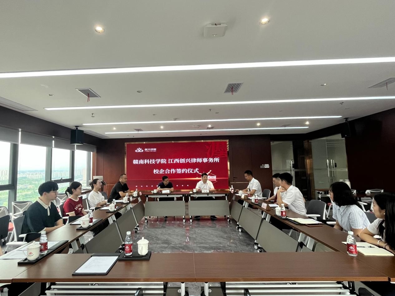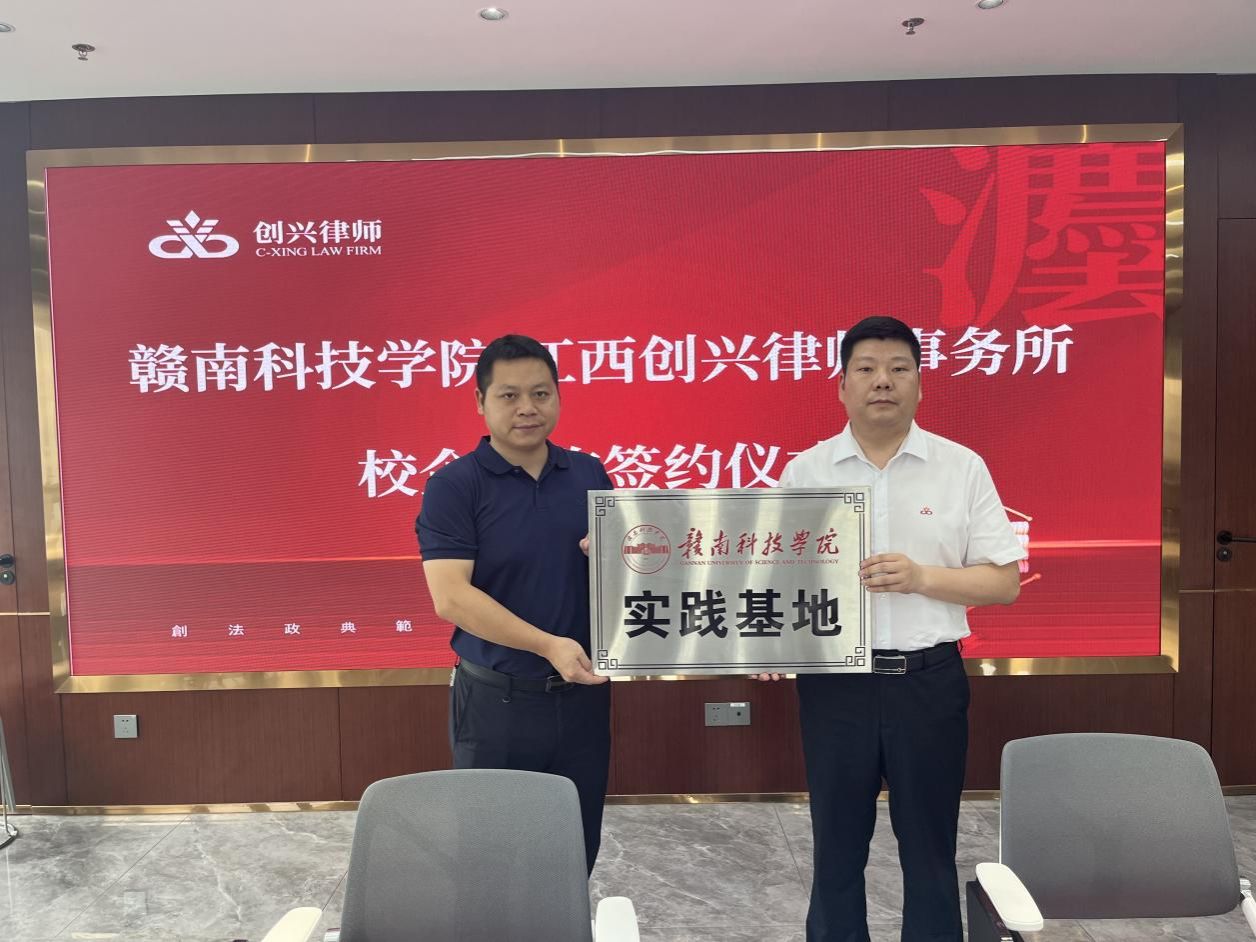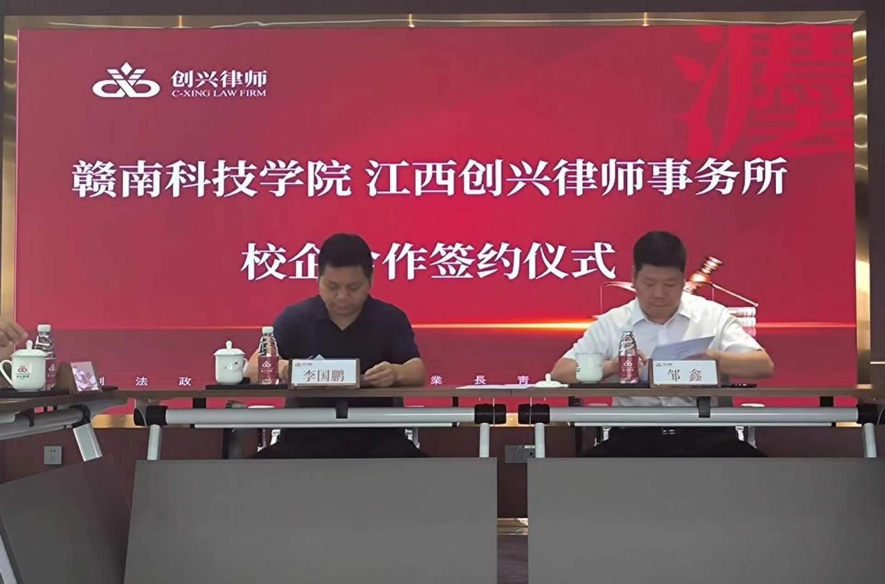 座谈会上,邹鑫对李国鹏一行的到来表示热烈欢迎,并介绍了江西创兴律师事务所的基本现状、未来发展及岗位需求等情况。李国鹏介绍了学校的基本情况、历史沿革以及专业建设取得的成果。双方围绕法律服务人才培养、法学实践教学以及创新院所合作模式等方面进行了深入的交流与探讨。双方代表在会议室现场签订了校企合作协议,并为“Beat365官方网站实践基地”揭牌。