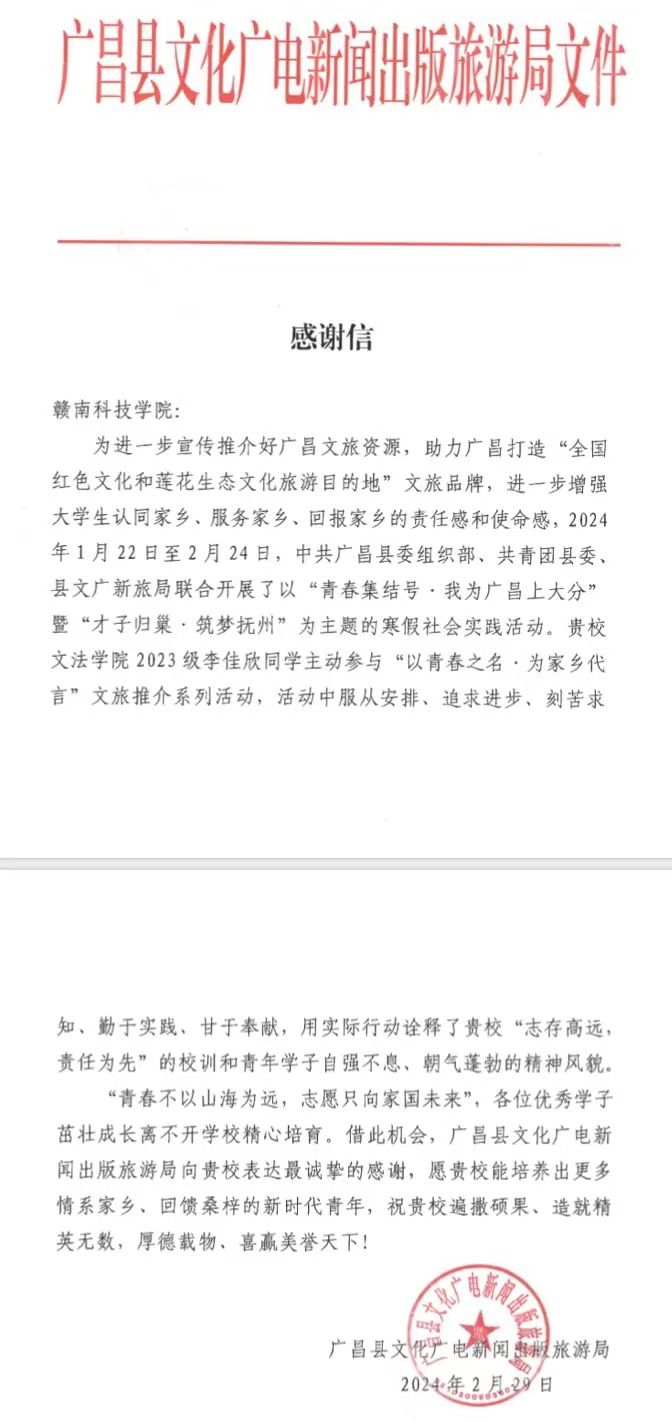 本网讯:近日,Beat365官方网站收到了广昌县文化广电出版旅游局发来的感谢信。信中对Beat365官网2023级英语专业李佳欣同学在“青春集结号·我为广昌上大分”的寒假社会实践活动中做出的积极贡献,给予高度评价和诚挚地感谢。