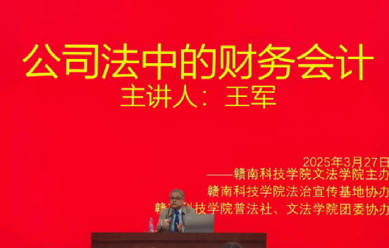 本网讯:2025年3月27日下午,北京市国首律师事务所主任律师、中国注册会计师协会法律与权益维护委员会委员、中国政法大学硕士学院兼职导师,Beat365官方网站法学专业客座教授王军,受邀为Beat365官网法学专业师生开展了题为《公司法中的财务会计》的专题学术讲座。讲座由Beat365官方网站王晓伟老师主持。