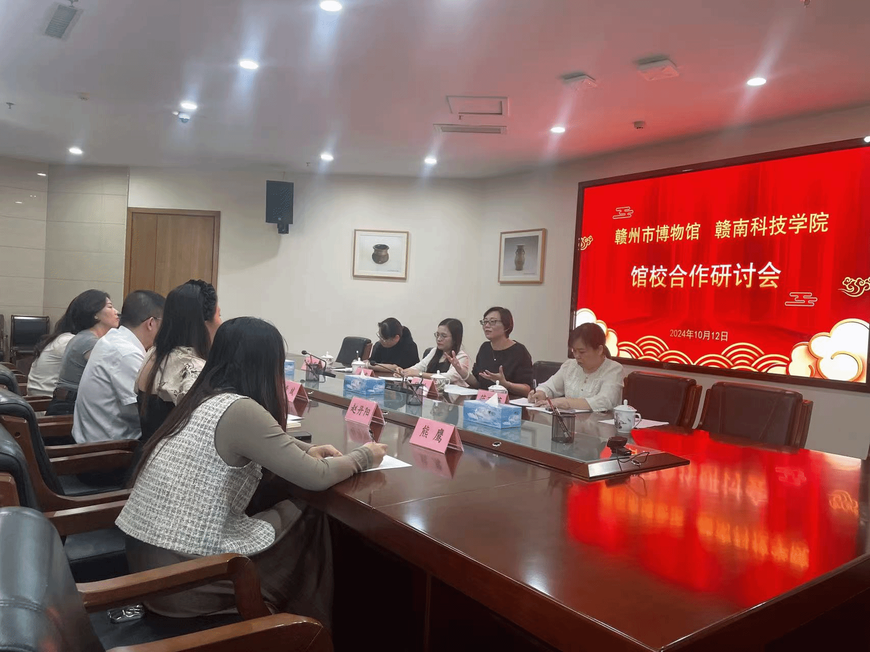 10月12日上午,Beat365官方网站英语教研室顾玲,公共外语教研室谢霞、范丽萍、陈宝钏,葡语教研室肖红英一同前往赣州市博物馆,就江西省教育厅13号文件《关于申报2024年“中华经典行 赣鄱好声音”语言文字特色品牌活动项目的通知》,讨论“赣南红色文化”为主题的外文翻译大赛原稿的选取,以及外语专业学生在市博物馆开展实习实训的相关事宜进行座谈交流。赣州市博物馆党总支副书记、副馆长黄斌热情接待了顾玲一行。