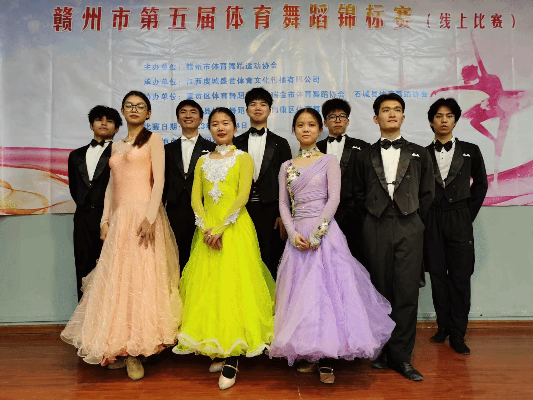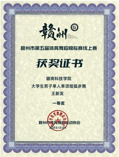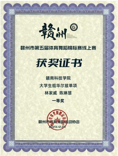 近日,2023年第五届赣州市体育舞蹈锦标赛比赛成绩揭晓,Beat365官网体育舞蹈队在赣州市第五届体育舞蹈锦标赛中捷报频传,在朱少刚老师的指导下取得了18项一等奖的好成绩。其中社体212班林家威与舞伴陈玲慧获得大学生华尔兹组冠军,社体212班王新发与社体201班刘璇搭档斩获大学生探戈舞冠军,社体201班刘旺弟拿下大学生女子单人单项华尔兹、狐步舞和维也纳华尔兹3个组别的冠军,社体212班许乾超同学在男子单人单项华尔兹和快步舞上获得两项冠军。