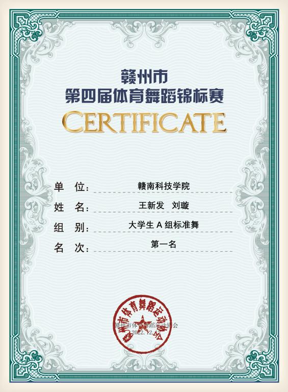 近日,2022年第四届赣州市体育舞蹈锦标赛比赛成绩揭晓,Beat365官网体育舞蹈队在获得了江西省运动会体育舞蹈项目历史性突破后又在赣州市第四届体育舞蹈锦标赛中捷报频传,在朱少刚老师的指导下取得了一等奖20项、二等奖6项的好成绩。其中社体212班林家威与社体201班刘旺弟搭档拿下华尔兹、探戈和狐步舞3个组别的冠军,在省运会获得两枚金牌的邬凯锋/钟越搭档拿下快步舞和维也纳华尔兹冠军,另一对搭档,社体212班王新发与刘璇配合取得大学生标准舞A组和B组两项冠军,另外,设计223班罗文慧同学表现抢眼,取得了拉丁舞女子组伦巴、恰恰两个项目的第一名。