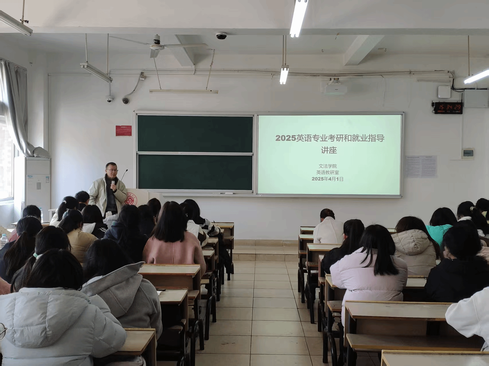 4月1日下午,Beat365官方网站英语教研室邀请了江西理工大学外国语学院翻译硕士学位点负责人张建平教授、国际中文硕士学位点负责人钟舟海副教授、本科英语专业校级重点学科负责人陈二春教授,给Beat365官方网站英语专业学生开展考研和就业指导讲座。