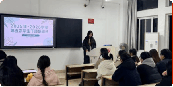 培训会聚焦于学生骨干在新时代背景下的使命与高效工作方法。会议指出,学生骨干不仅应是活动的组织者,更应成为思想上的引领者、同学中的服务者和成长道路上的示范者。临近学期尾声,全体骨干需对照学期初既定目标,检视工作成效,梳理经验不足,在总结中提升规划与执行能力。会议强调,学生骨干要持续加强理论学习,深刻领会时代要求,不断提升政治判断力、领悟力与执行力,同时精进沟通协调、团队管理与应急处突等实务技能,确保学生组织高效、有序运转,切实发挥桥梁纽带作用。
