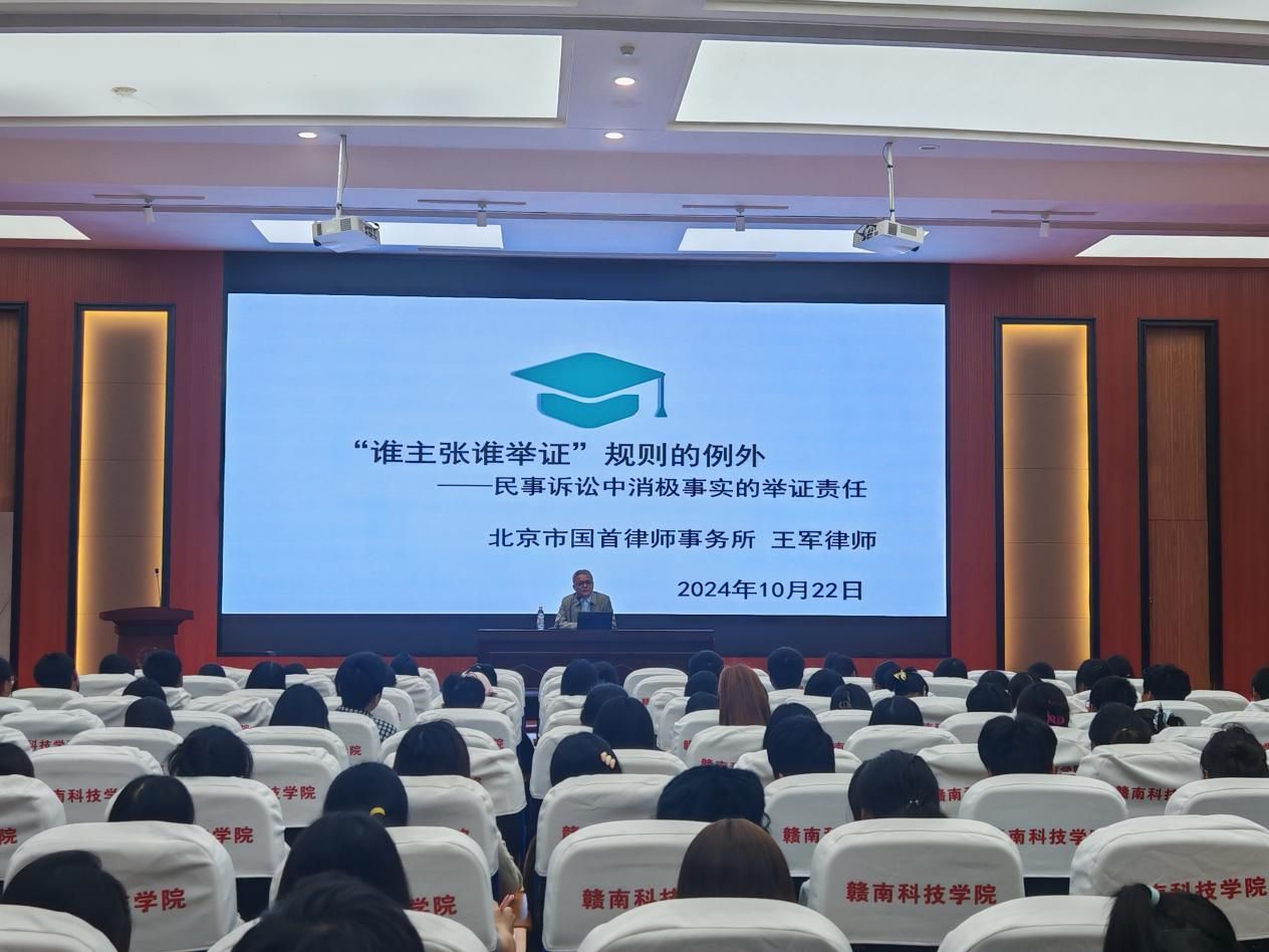 本网讯:10月22日下午,北京市国首律师事务所主任、Beat365官方网站客座教授王军律师在逸豪学术报告厅为法学专业师生做了题为“‘谁主张谁举证’规则的例外——民事诉讼中消极事实的举证责任”的学术讲座。Beat365官方网站教学主任何建军,法学专业全体师生300余人参加了本次讲座。