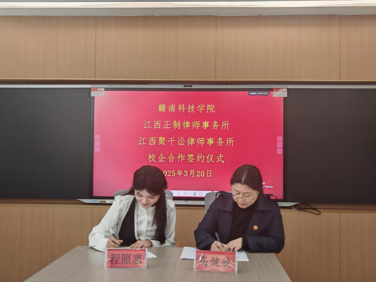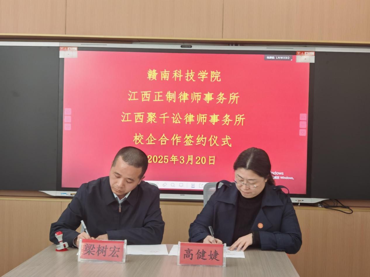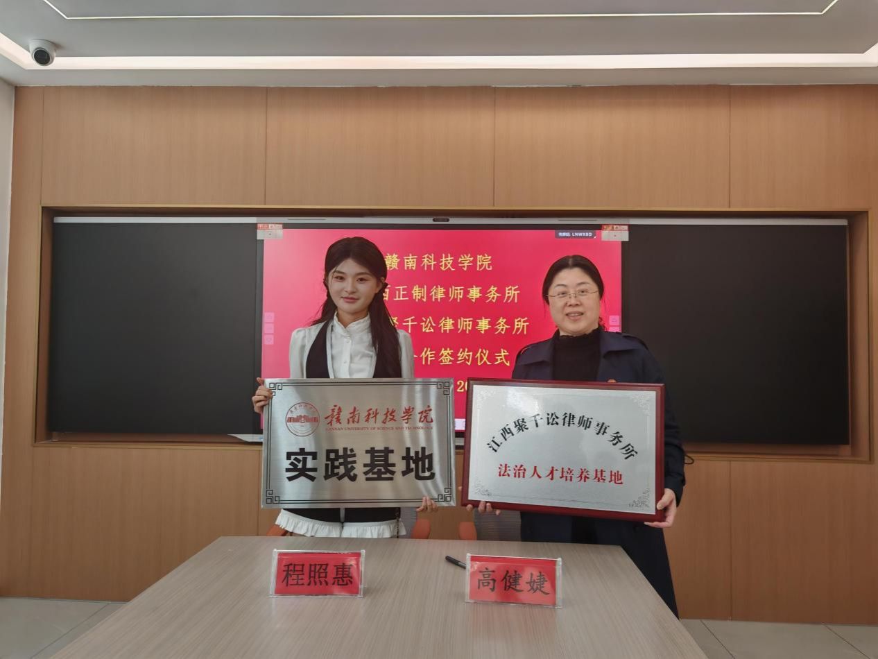 Beat365官方网站党委委员、副院长高健婕和聚千讼律所主任程照惠代表双方签署《校企合作协议》,并共同为“江西聚千讼律师事务所法治人才培养基地”及“Beat365官方网站实践教学基地”授牌,聚千讼律所黄家望等见证签约授牌。
