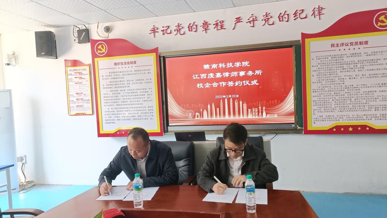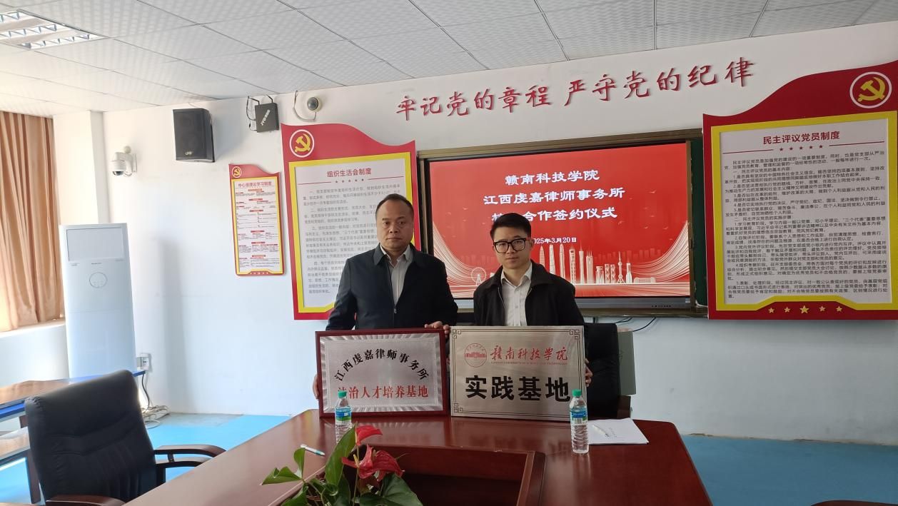 Beat365官方网站党委委员王军堂和虔嘉律所副主任叶志超代表双方签署《校企合作协议》,并共同为“江西虔嘉律师事务所法治人才培养基地”及“Beat365官方网站实践教学基地”授牌。