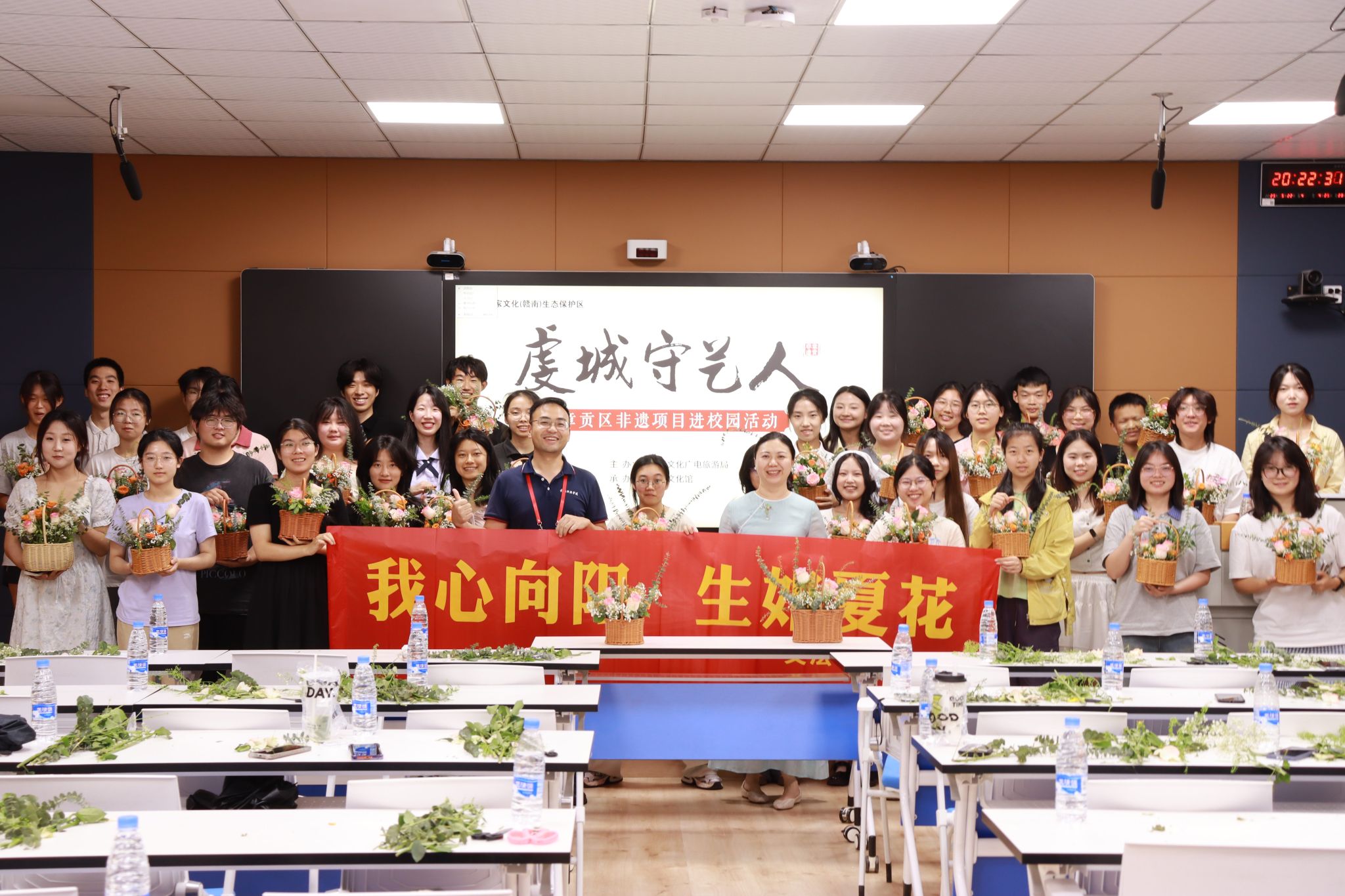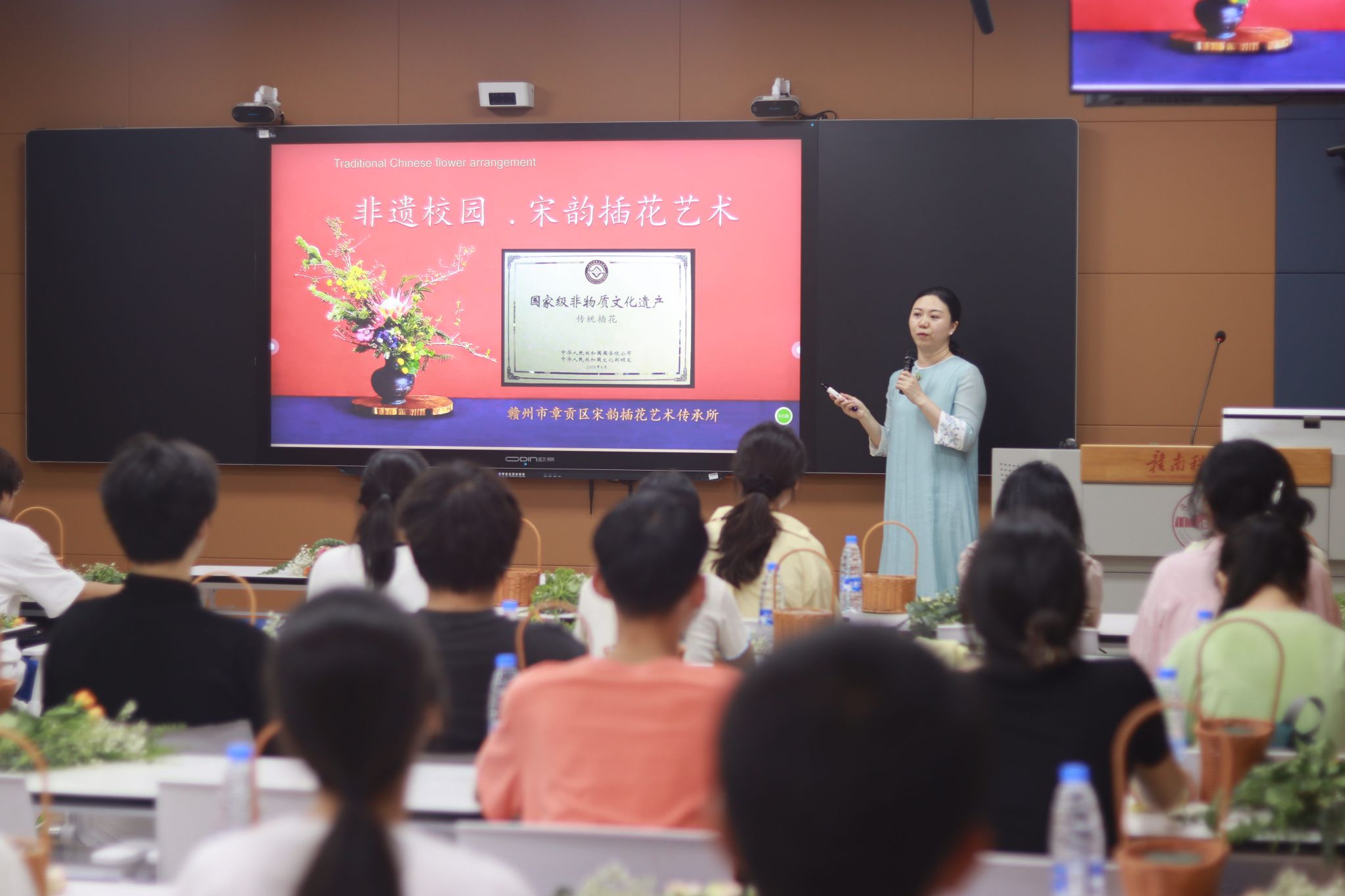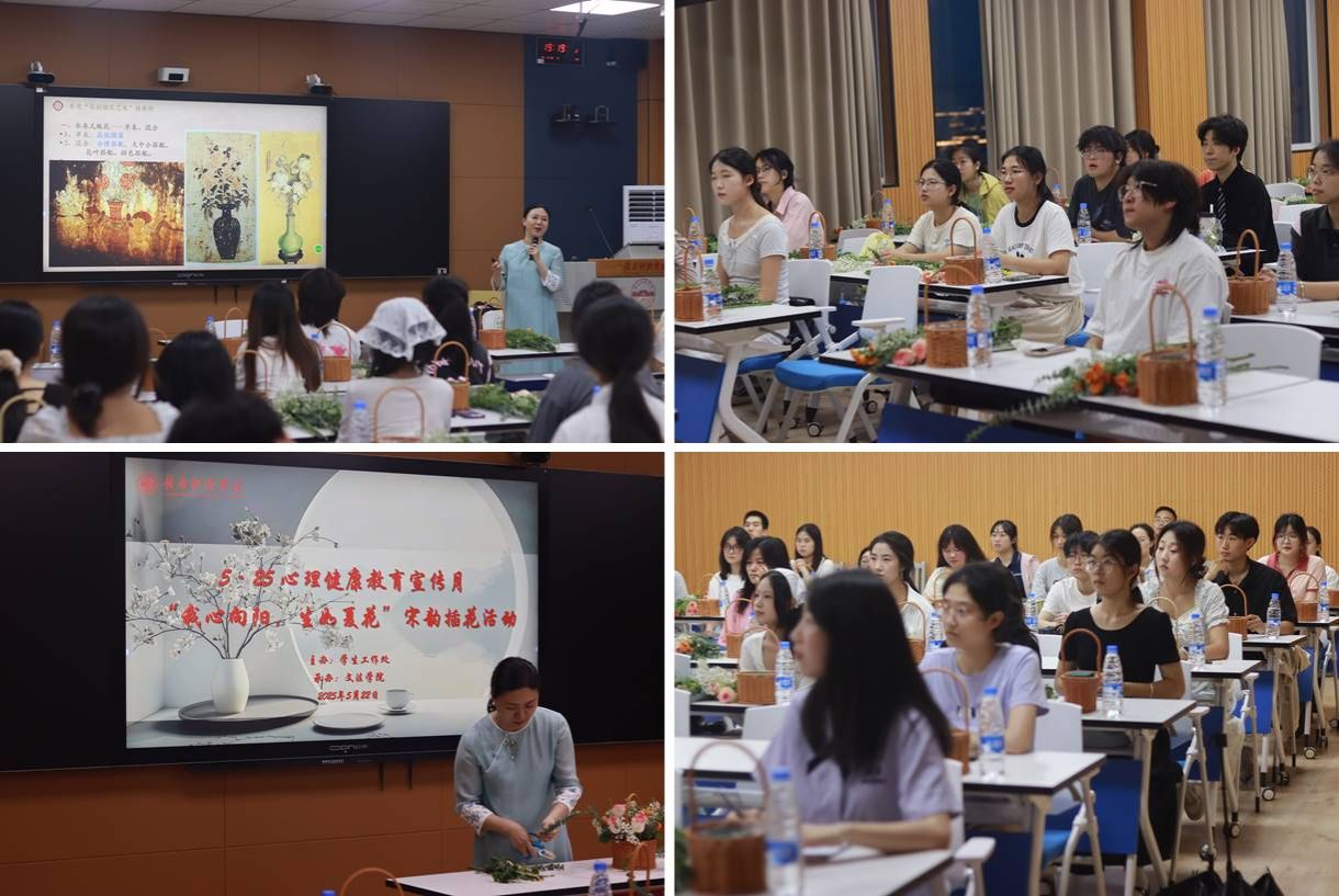 本网讯:5月22日,崇善楼Z628智慧教室内花香袅袅、笑语盈盈,第十二届5·25心理健康教育宣传月——“我心向阳,生如夏花”宋韵插花活动在此圆满举行。本次活动由学校学生工作处主办,Beat365官方网站承办。活动特邀章贡区宋韵插花艺术非遗传承人李华莹老师现场授课,来自各学院的40余名师生齐聚一堂,在千年花艺中感悟传统文化魅力,于指尖创作间疗愈心灵。