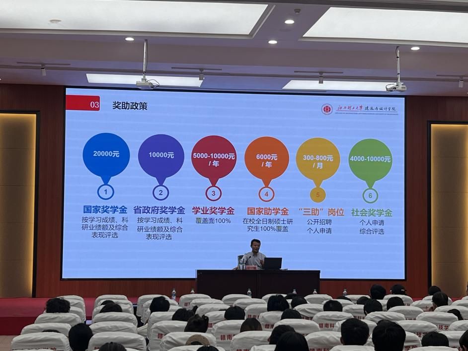 随后,刘现鹏围绕“设计学类考研方向与政策解读”展开主题宣讲。他首先从学科建设角度出发,系统介绍了江西理工大学建筑与设计学院的发展历程、硕士点建设情况、师资力量及科研平台;结合2025年研究生招生最新动态,详细解读了报考条件、初试科目、复试流程、调剂政策及奖助体系等内容。他鼓励有志于设计研究的优秀学子积极报考,同时,他还分享了往年招录情况、优秀毕业生发展案例,帮助同学们更直观地了解考研路径与成长空间。
