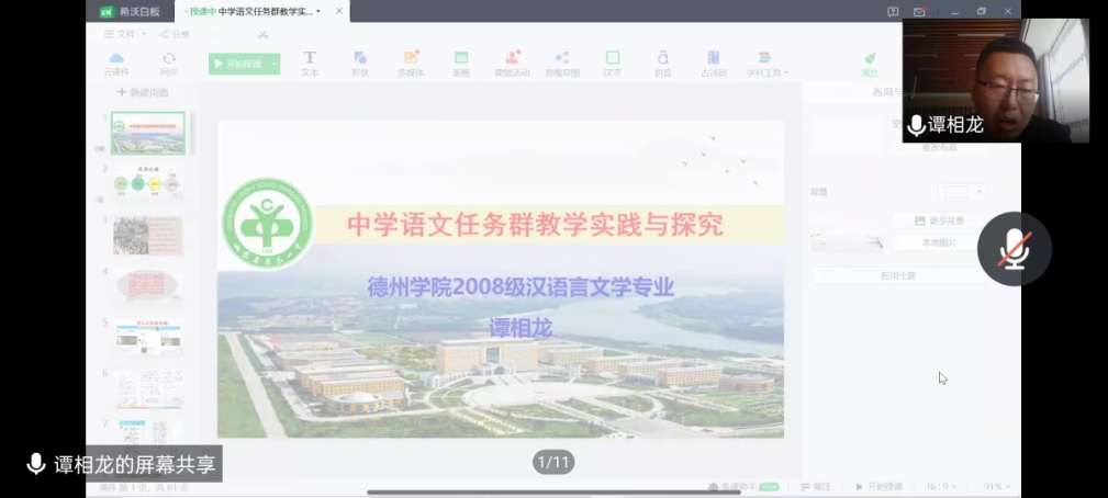 5月11日是kaiyun开云官方建校51周年校庆日。文学与新闻传播学院邀请2012届汉语言文学本科班校友谭相龙为2022届应届毕业生做线上讲座。谭相龙现就职于潍坊昌邑市第一中学,中学一级教师,从教十年来,多次获得昌邑市优秀班主任、十佳班主任、创新型班主任荣誉称号;获得潍坊市教学成果二等奖。此次讲座,谭相龙以《中学语文任务群教学实践与探究》为题,为即将毕业的2022届汉语言文学专业学生带来了一场精彩的报告,帮助即将走上中学语文教师岗位的同学们了解教师岗位要求,建立职业自觉、创新工作方式方法、启发教科研兴趣。此次报告会得到了文学院师生的一致认可和广泛好评。